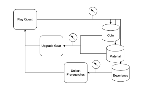 Many articles have been written about game core loops especially in the context of F2P live operated games. While the importance of a coherent core loop is especially important in live operated games for player retention and monetization, loops that reinforce certain gameplay exist in all games. A simple example is shown below for a hypothetical RPG.